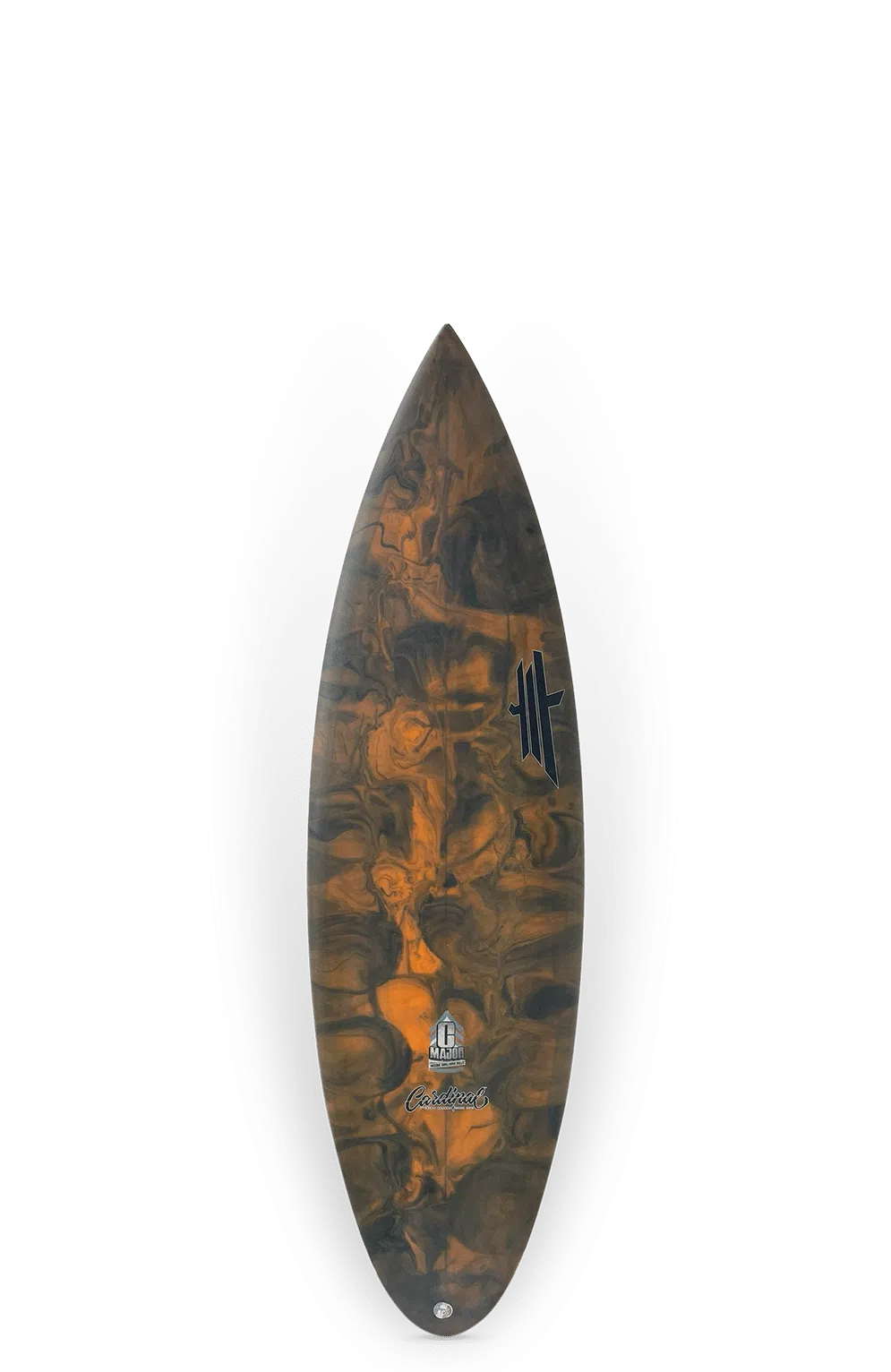 Shapers-Club- La planche de surf C-Major, mesurant 5'8 avec des ailerons de 19", présente un design marbré en tourbillons noirs, orange et gris. Elle a un nez pointu et affiche le logo C-Major et un graphique centré sur un fond dégradé noir à gris. -surfshop-surfboard