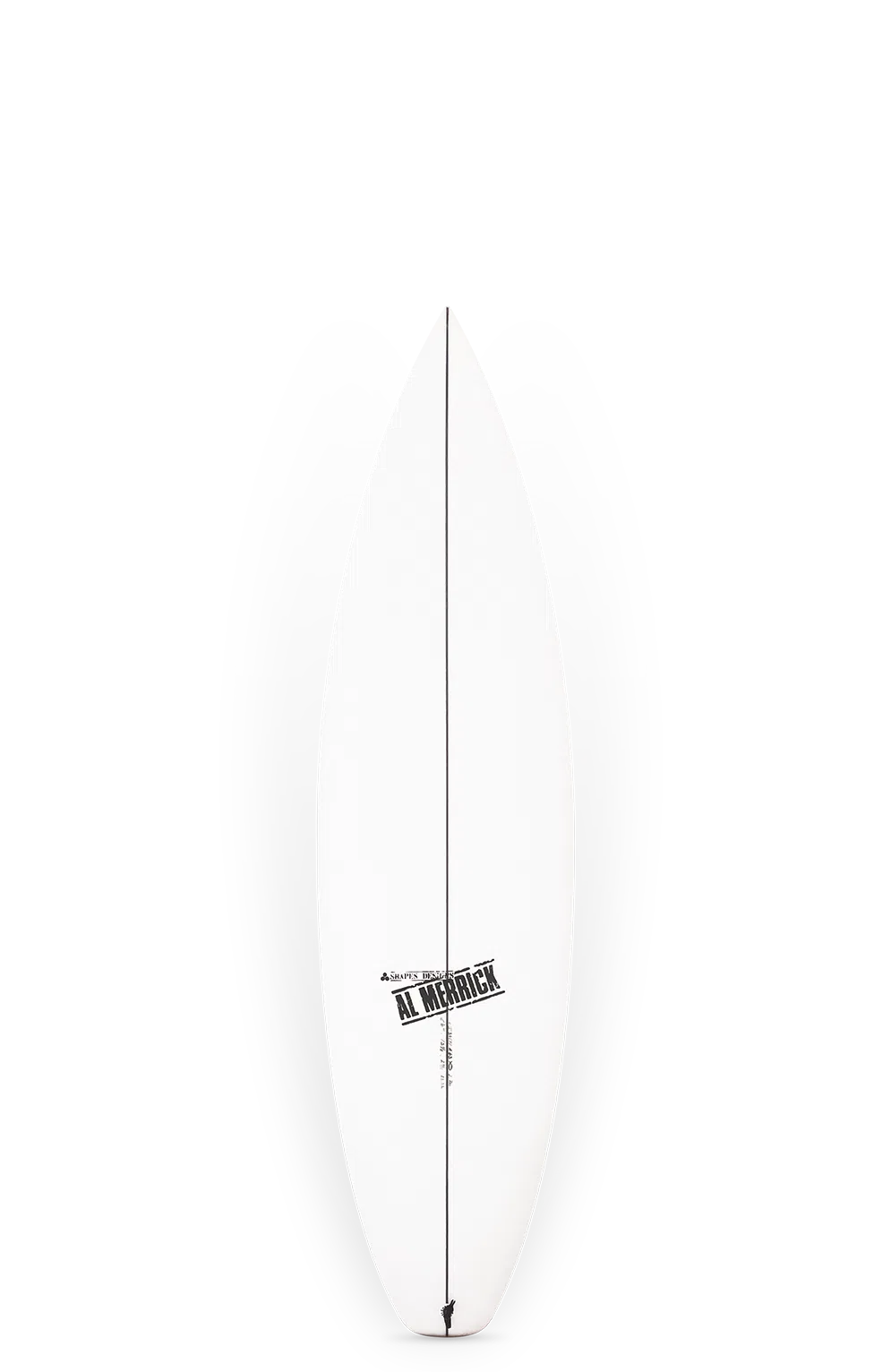 Shapers-Club- Une planche de surf blanche CI 2P PRO (6'2" x 19 1/2" x 2 9/16", 32,8L) avec un nez pointu, un logo noir "Al Merrick" au centre, trois boîtiers Futures Fins près d'une queue de poisson et un design minimaliste épuré. -surfshop-surfboard