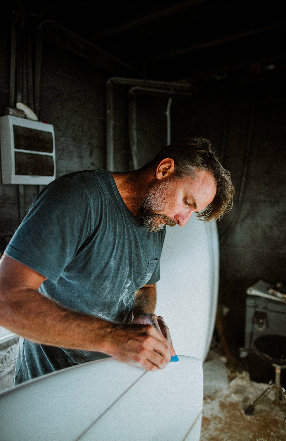 Neal réalise le shape à la main, puis nous prenons soin de glacer et finir votre planche dans notre atelier.