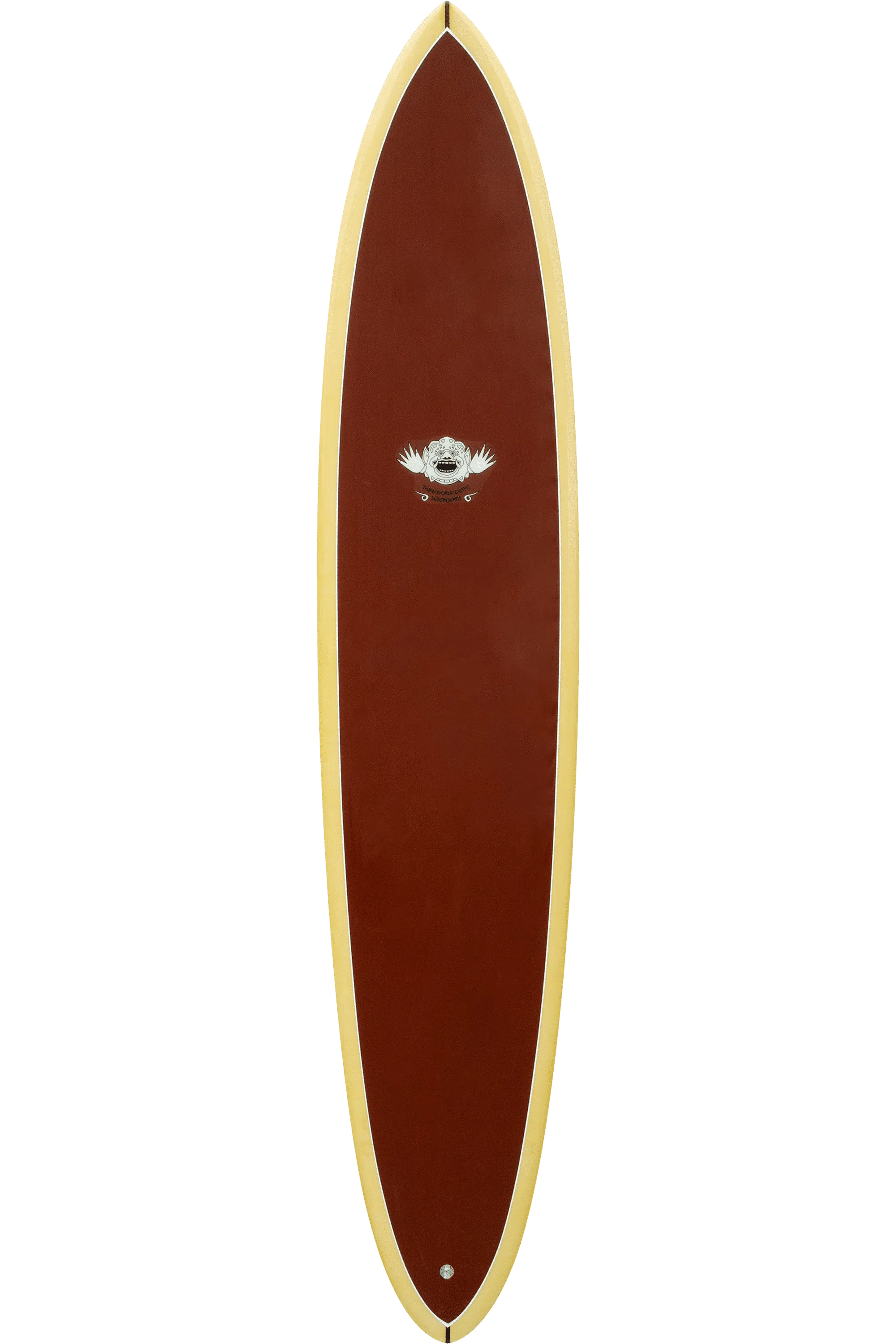 Shapers-Club- Une planche de surf simple de 9'6", en particulier la Magic Larmo de Larry Mabile, dotée d'un pont marron et de rails de couleur bois clair. La planche a un logo distinctif avec des motifs en forme d'ailes entourant un emblème circulaire près du centre. Le fond est équipé d'un boîtier d'aileron pour la fixation des ailerons. Les dimensions de la planche de surf sont de 9'6" x 22 1/2" x 3 1/4". -surfshop-surfboard