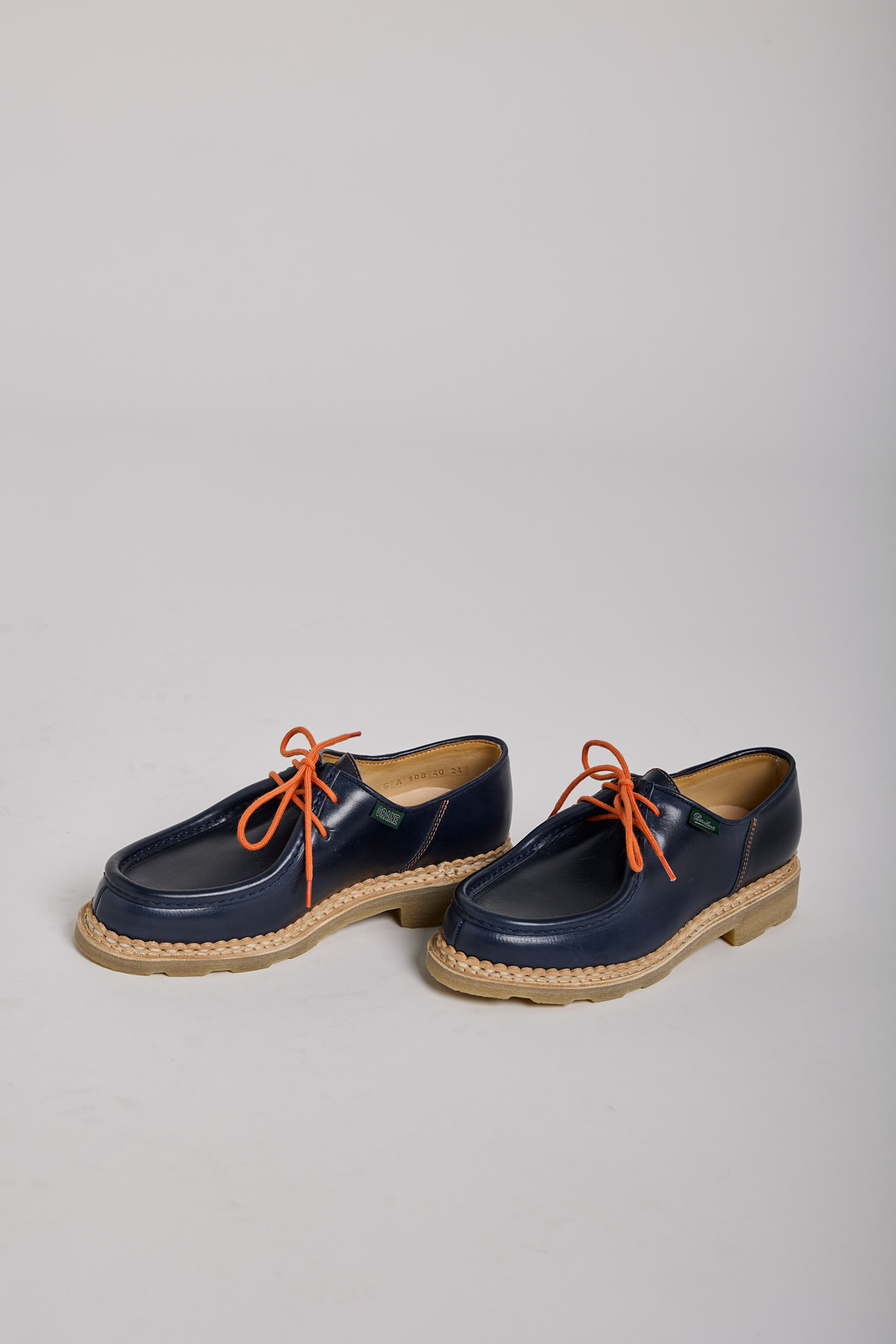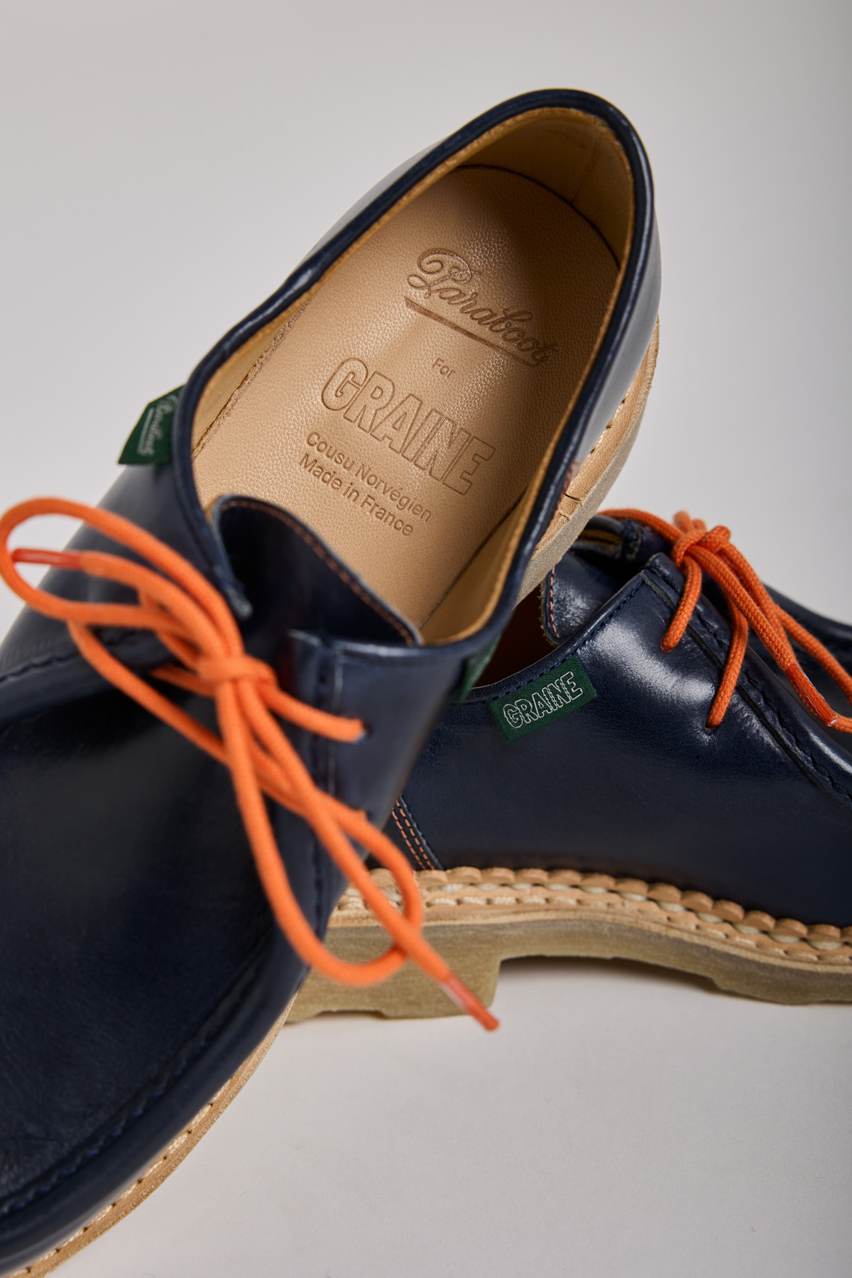 Le choix d’un montage cousu norvégien, signature Paraboot, garantit robustesse et longévité. Les touches contrastées — comme les **lacets orange sur cuir bleu navy** — apportent une note contemporaine à cette silhouette intemporelle.