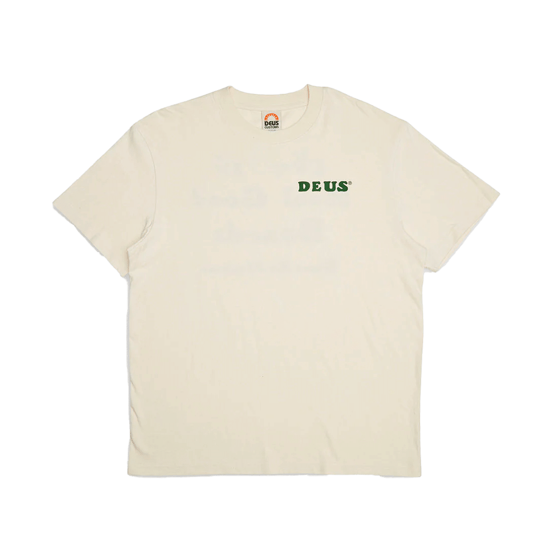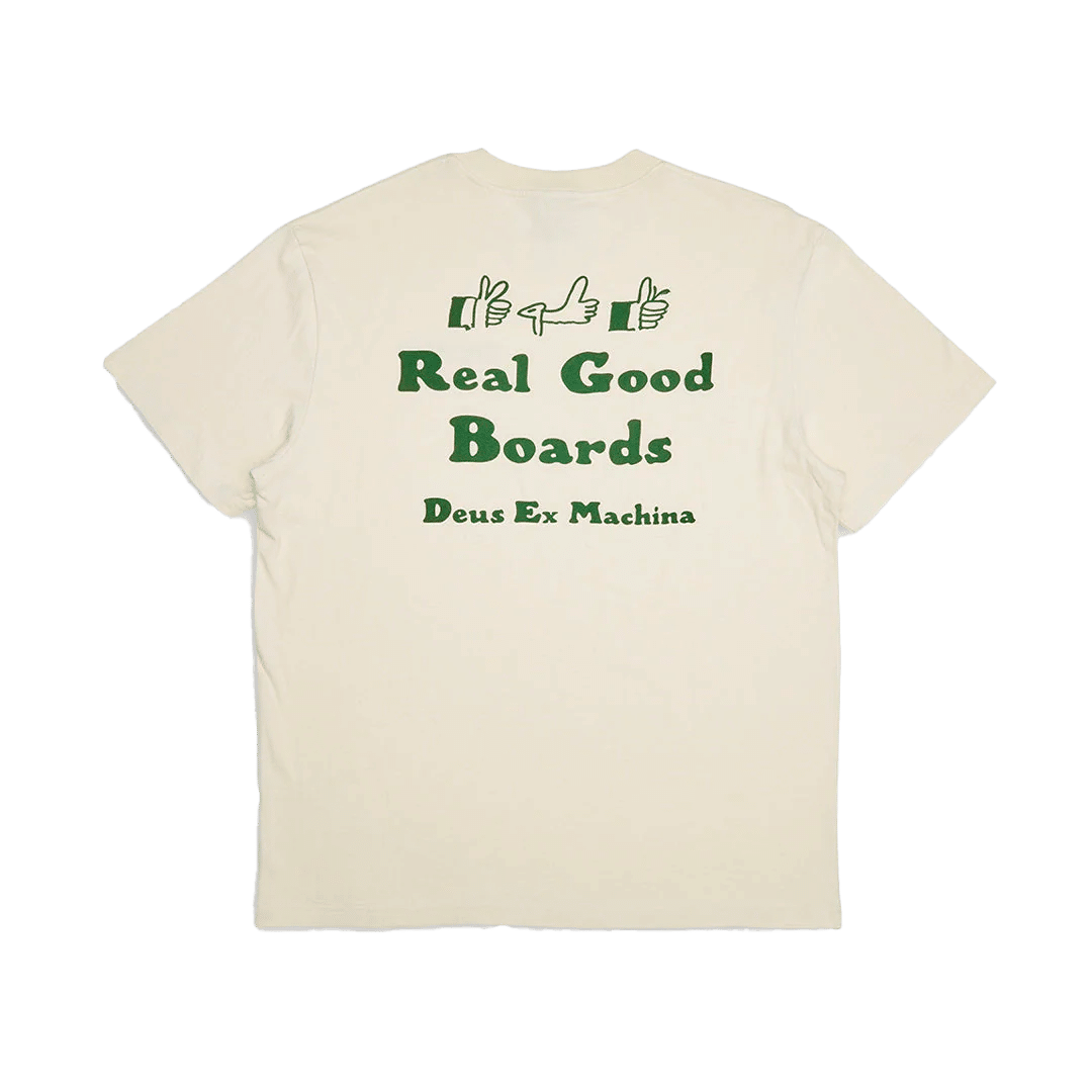 T-shirt loose fit DEUS EX MACHINA disponible en bleu marine/blanc et crème/vert, conçu en jersey de coton recyclé de 220gsm. Finition avec un lavage enzyme lourd pour un aspect vintage, il arbore un imprimé "Real Good Boards" qui célèbre la culture du surf et l'esprit authentique.