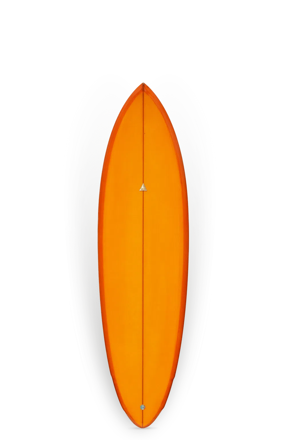 Shapers-Club- Une image de la planche de surf Addiction Clincher 6'6" x 20' 5/8" x 2' 3/4" 42L, mettant en valeur sa teinte orange avec un nez pointu et une queue arrondie, vue d'en haut. Le design élégant et épuré présente une seule dérive au centre du bas. Le fond blanc uni accentue la forme et la couleur vive de la planche de surf. -surfshop-surfboard