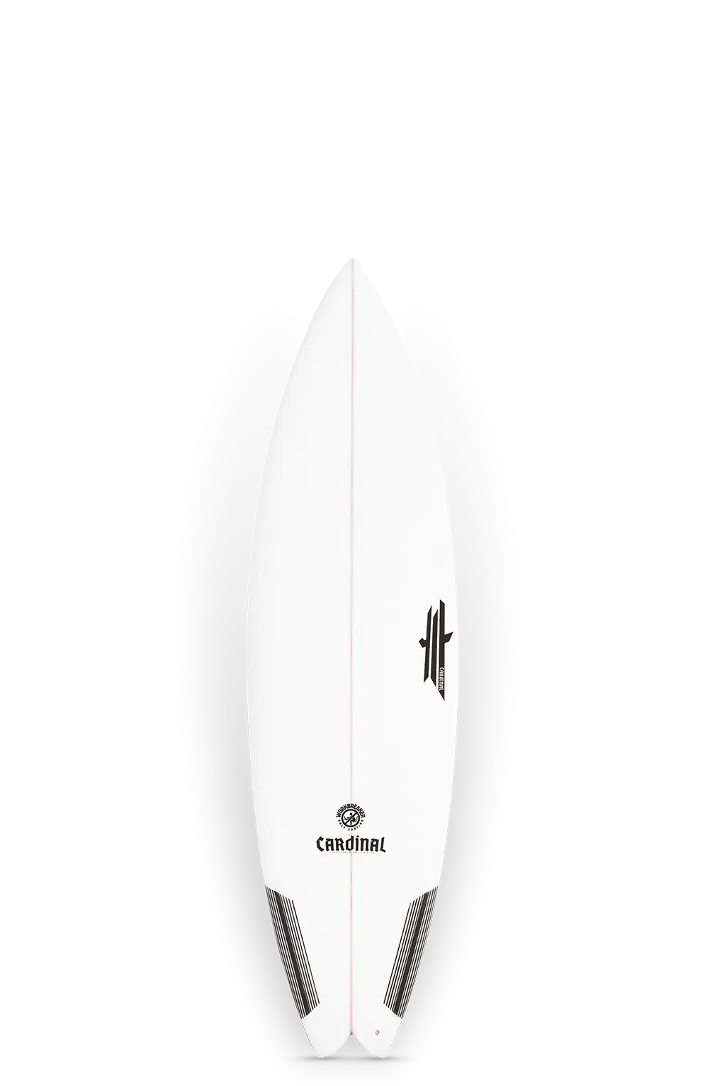 Shapers-Club- La moderna tavola da surf Workbreaker, di dimensioni pari a 5'10" x 19 1/2" x 2 3/8", presenta una coperta bianca e rails neri con il marchio "Cardinal" e un logo stilizzato su sfondo bianco. Ha un volume di 28 litri. -surfshop-surfboard