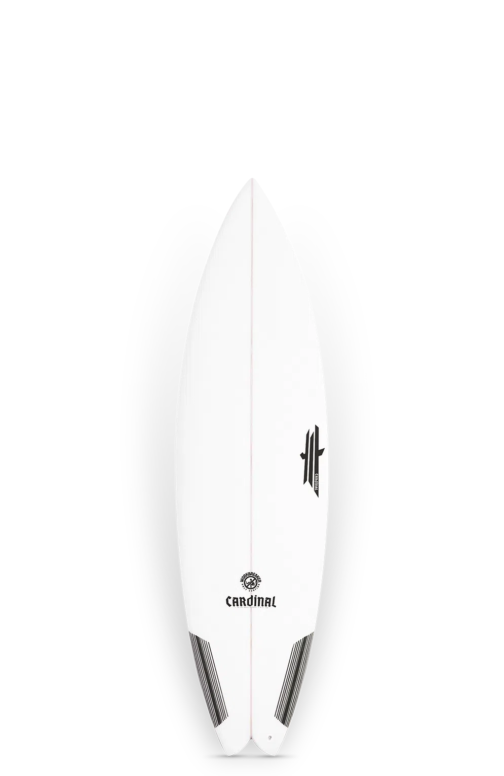 Shapers-Club- Immagine della tavola da surf Workbreaker, bianca con bordi neri e grigi e un piccolo logo «Cardinal» vicino al naso. Con il suo design elegante e la capacità di 31 litri, è perfetta per gli appassionati di surf che cercano prestazioni ottimali. Dimensioni: 1 metro e 80 x 1 metro e 80 x 2 metri e mezzo. -surfshop-surfboard