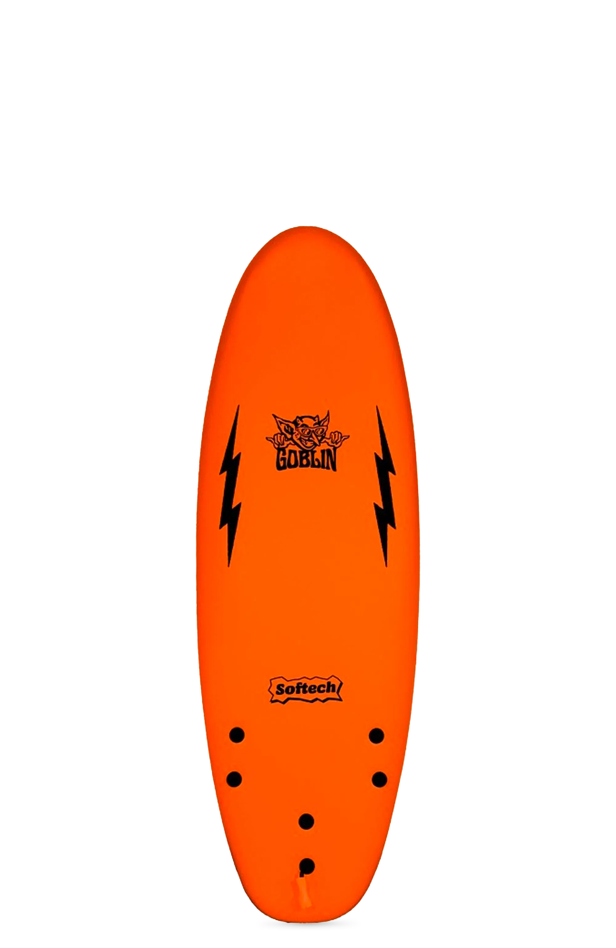 Shapers-Club- Une planche de surf Softech orange vif avec le graphisme « Goblin » avec des éclairs noirs, une configuration à quatre ailerons et une capacité de 41 L pour des performances optimales. -surfshop-surfboard