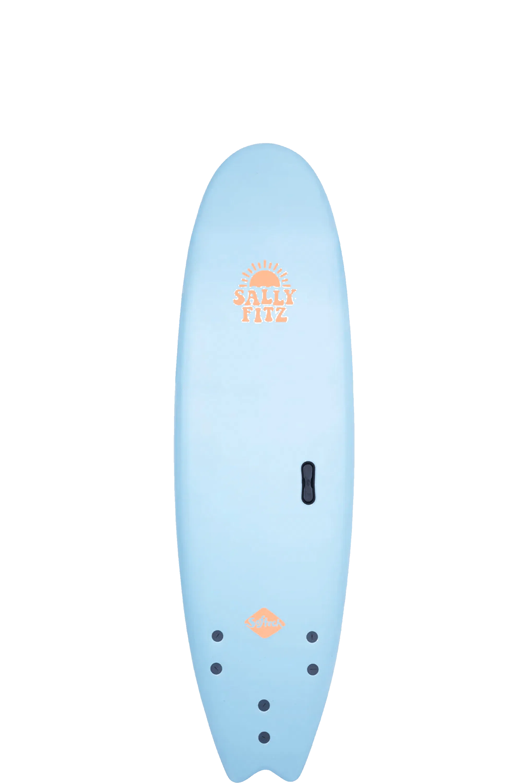 Shapers-Club- Tavola da surf Sally Fitzgibbons FB 7'0 Mist realizzata a mano da SOFTECH in azzurro, con un sole e il logo "CATCH SURF" in arancione nella parte superiore e un semplice logo a diamante arancione nella parte inferiore. Questa tavola ha un nose arrotondato e una configurazione a doppia pinna nella parte posteriore, perfetta per dare sfogo alla Sally Fitzgibbons che è in voi. -surfshop-surfboard