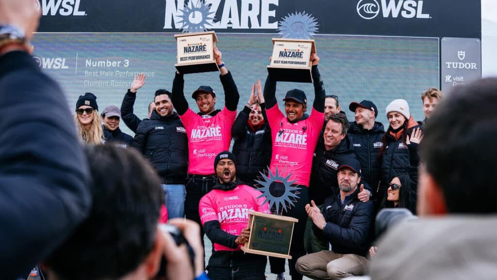 Pour ceux qui découvrent, la compétition par équipes à Nazaré, c’est simple : chaque équipe est formée de deux surfeurs qui combinent leurs meilleures vagues pour scorer au max. Cette année, Clément Roseyro (encore lui !) associé au local portugais Nic Von Rupp a formé un duo ultra solide. Grâce à leur complicité évidente, ils ont parfaitement exploité les vagues de Nazaré. Leur stratégie, clairement, c’était l’attaque ! Et ça a payé puisqu’ils remportent l’épreuve haut la main. Voici aussi le podium final et les autres équipes qui ont marqué la compet'.